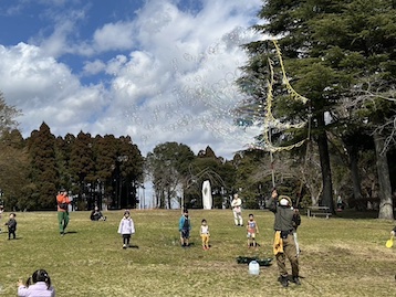 手作りの道具を使い、次々と大量のシャボン玉を空に飛ばしていて、子どもたちは大興奮。